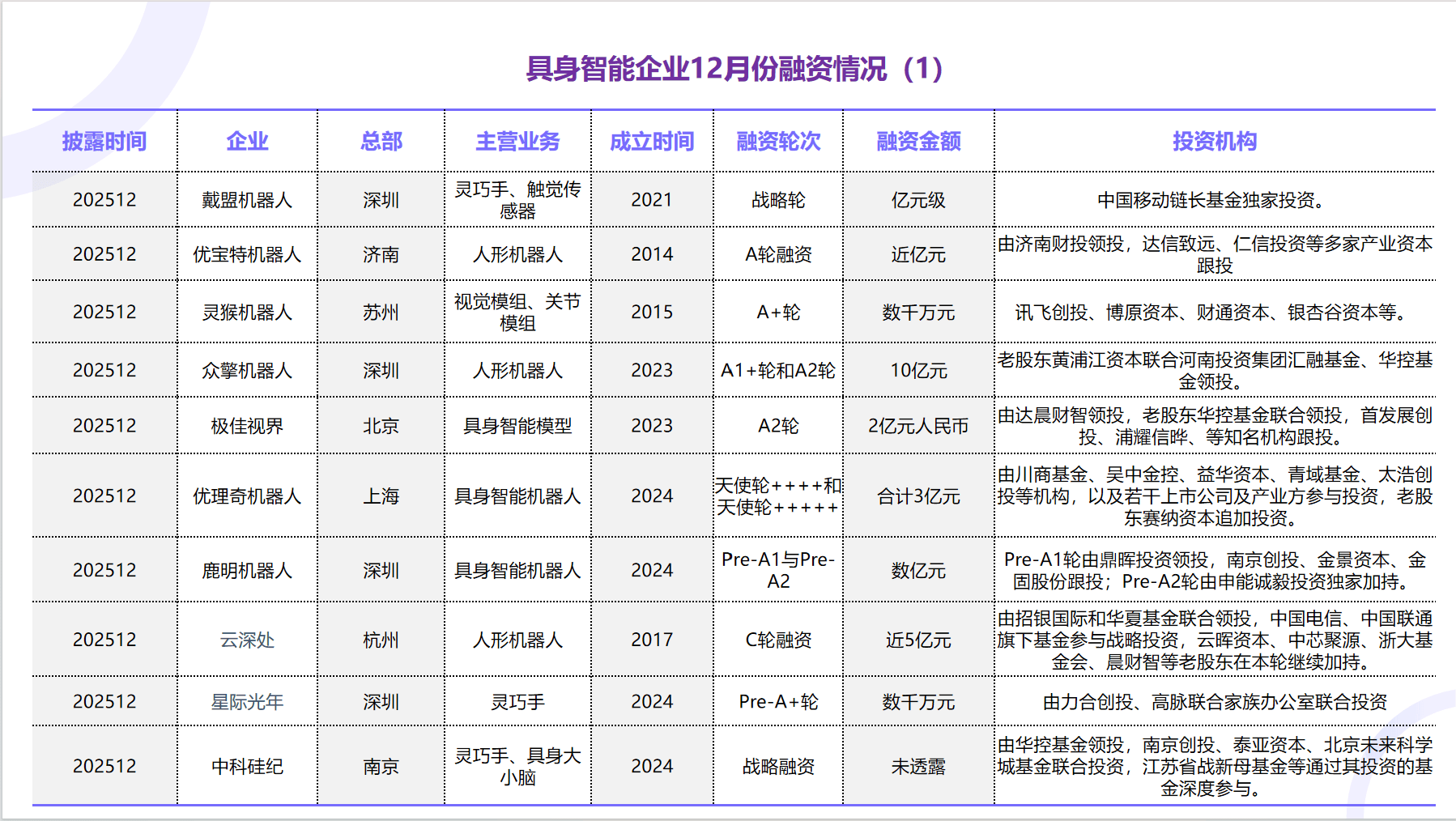 2025年12月份:国内具身智能机械人企业融资环境